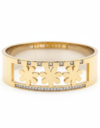 Floral Cut-Out Gold-Plated Stainless Steel Bangle with Crystal Accents