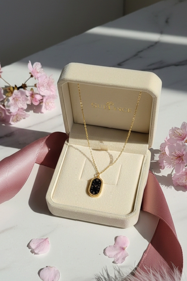 - ​Timeless Aesthetic: Features a classic oval medallion with a deep black enamel face, accented by elegant gold Roman numeral markers for a sophisticated, “vintage-watch” inspired look.