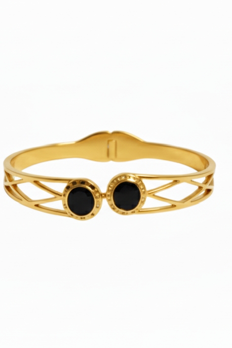 ​This elegant open-style bangle combines modern geometric design with classic sophistication. Crafted from high-quality gold-tone stainless steel, it features a unique criss-cross or lattice-work pattern along the sides, providing a lightweight yet structured look. The centerpiece of the design is two circular, polished black stones (often Onyx or black crystal) set in textured golden bezels. This piece is designed for durability and daily wear, offering a sleek alternative to traditional solid gold bangles while maintaining a luxury aesthetic.