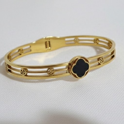 This elegant open-style bangle combines modern geometric design with classic sophistication. Crafted from high-quality gold-tone stainless steel, it features a unique criss-cross or lattice-work pattern along the sides, providing a lightweight yet structured look. The centerpiece of the design is two circular, polished black stones (often Onyx or black crystal) set in textured golden bezels. This piece is designed for durability and daily wear, offering a sleek alternative to traditional solid gold bangles while maintaining a luxury aesthetic.