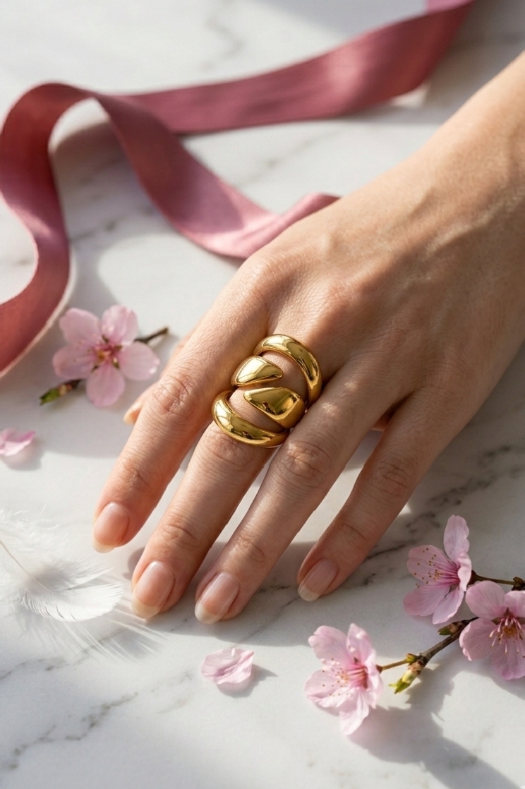 ​This bold statement ring features a modern, multi-layered silhouette that mimics the look of three stacked bands in one seamless piece. Crafted from high-quality stainless steel with a polished gold finish, it combines organic, teardrop-inspired shapes with clean geometric lines. The open-space “cut-out” design gives it a lightweight, airy feel while maintaining a chunky, high-fashion presence on the finger.