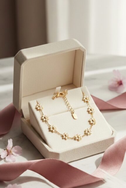This is a stunning product shot. The combination of the sleek gold-toned jewelry against the soft pink cherry blossoms and silk ribbon creates a very elegant, “celestial spring” aesthetic.