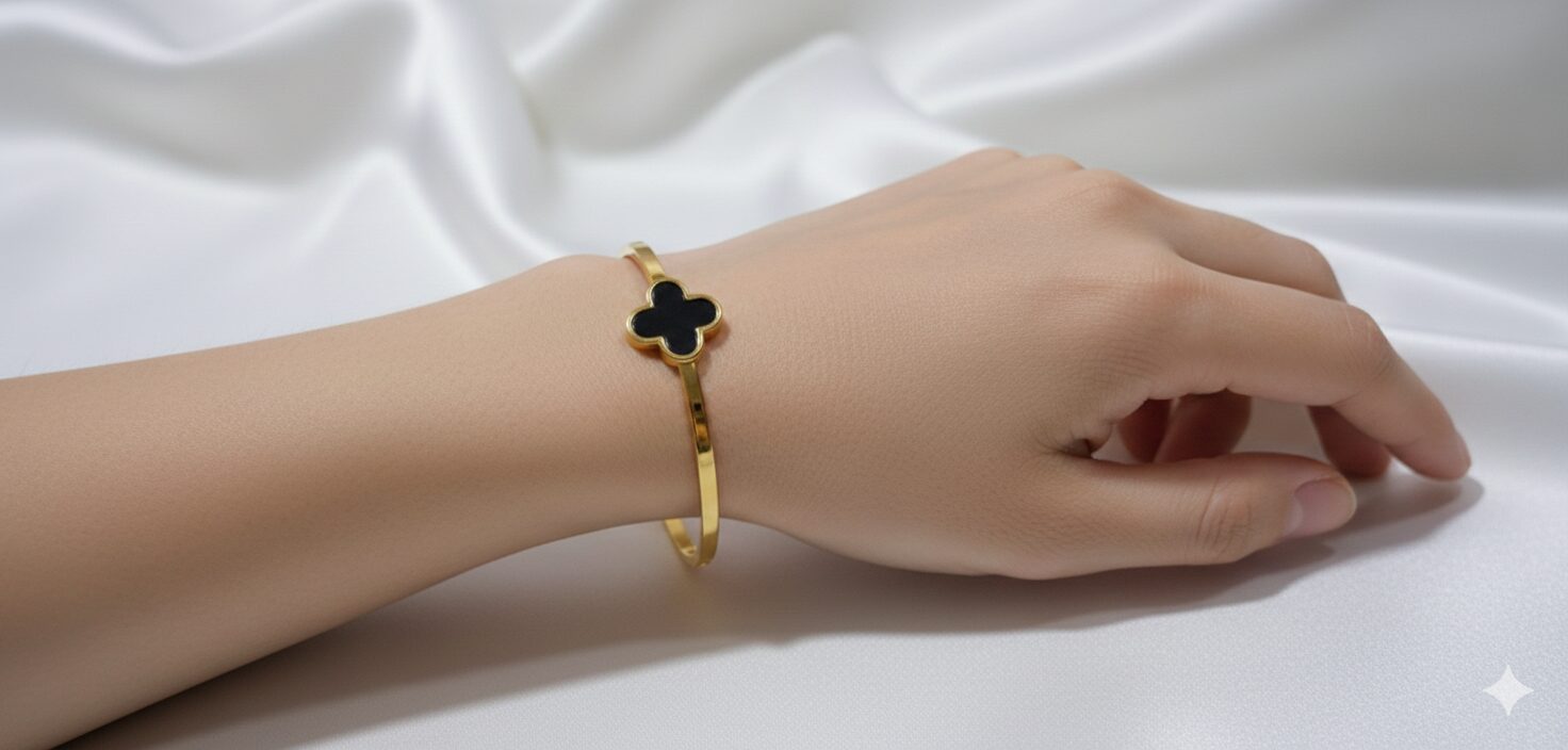 Based on the image, this is a sophisticated Four-Leaf Clover Bangle, a piece that blends modern minimalism with classic symbolic charm. Crafted from durable gold-plated stainless steel, it is designed for longevity and effortless daily wear.