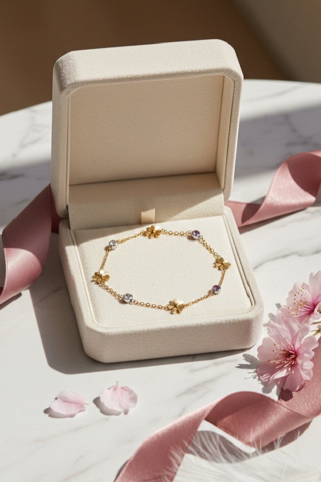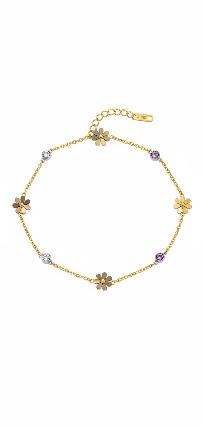 This delicate station-style bracelet blends whimsical floral motifs with modern durability. Featuring alternating metallic daisies and bezel-set crystals, it offers a sophisticated “garden-party” aesthetic that transitions perfectly from day to night.