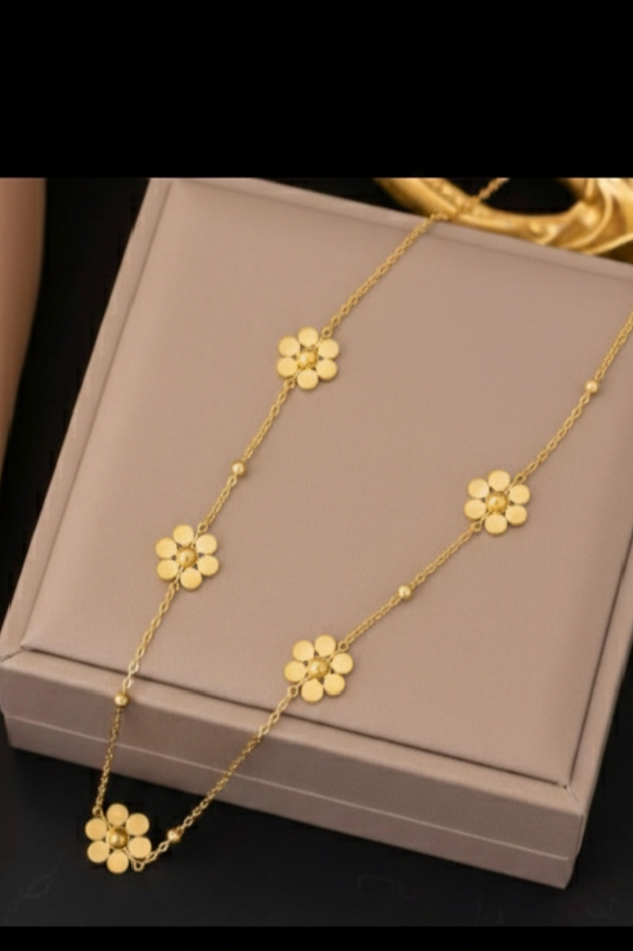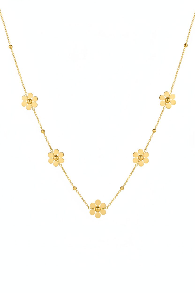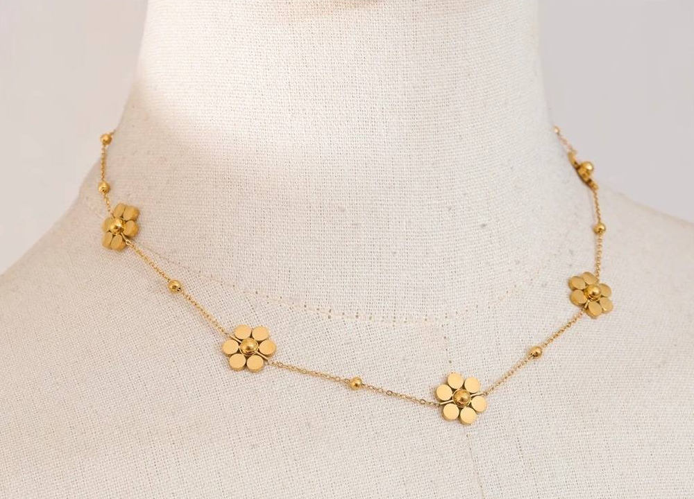 In addition to the flowers, the chain is accented with small gold beads (satellites). This adds texture to the fine link chain and ensures the piece looks sophisticated whether worn alone or layered.