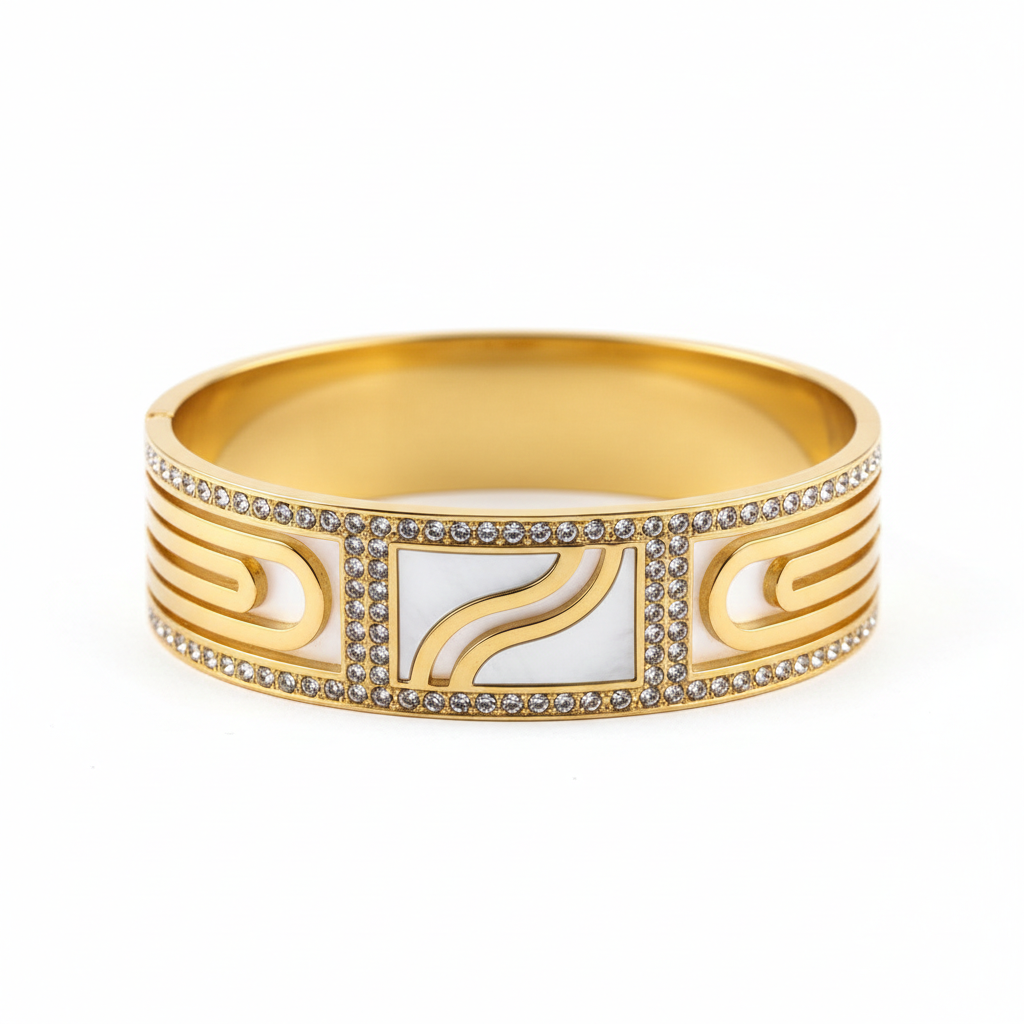 - Pave Crystal Accents: Two bands of sparkling clear crystals (likely cubic zirconia) line the top and bottom edges of the bangle, with a vertical divider of crystals in the center.