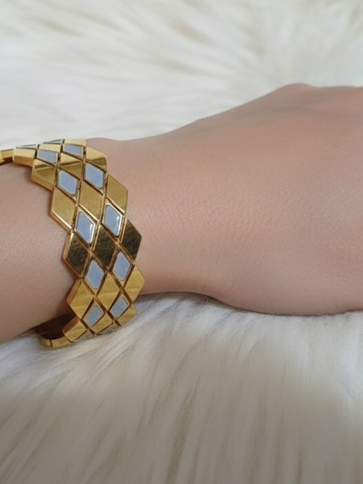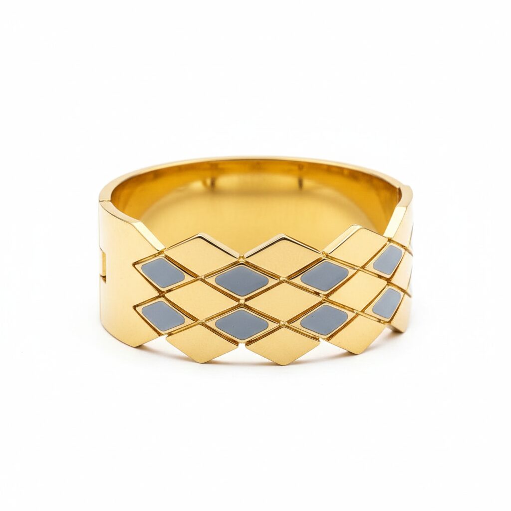 Elevate your wristwear with this bold, architectural statement piece. Crafted from high-quality stainless steel, this wide-band bangle features a sophisticated multi-dimensional diamond grid. The polished gold finish is beautifully contrasted by subtle light-catching inlays, creating a textured, quilted effect that transitions perfectly from professional daywear to evening glamour. Its sturdy hinged construction ensures a secure fit while maintaining a sleek, seamless aesthetic
