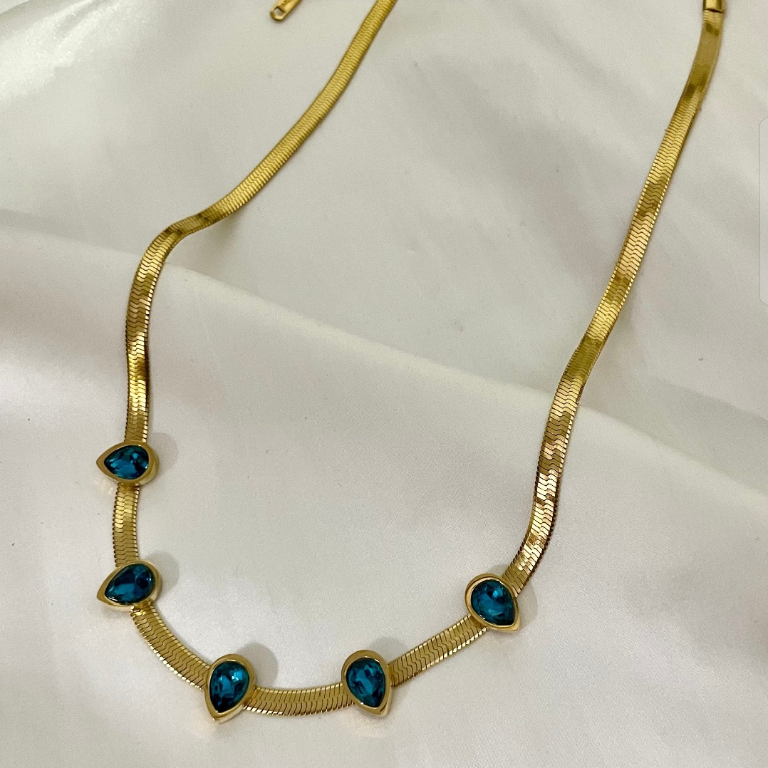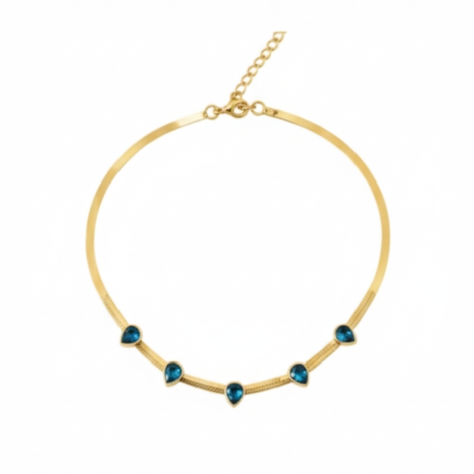 This piece is a striking Gold-Plated Stainless Steel Herringbone Choker with Teardrop Crystal Accents. It combines a sleek, modern silhouette with a touch of vintage-inspired glamour.