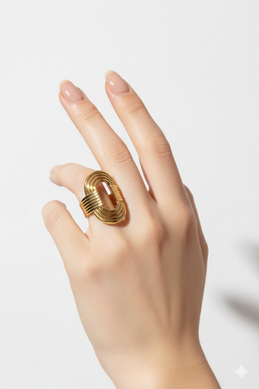 Elevate your jewelry collection with the Aurelian Orbit Ring, a masterpiece of modern architectural design crafted from premium high-grade stainless steel. This statement piece features a captivating series of concentric, elongated golden bands that create a sense of fluid motion and depth. Its bold, open-centered silhouette offers a contemporary twist on classic luxury, making it the perfect centerpiece for both avant-garde evening wear and sophisticated daily styling.