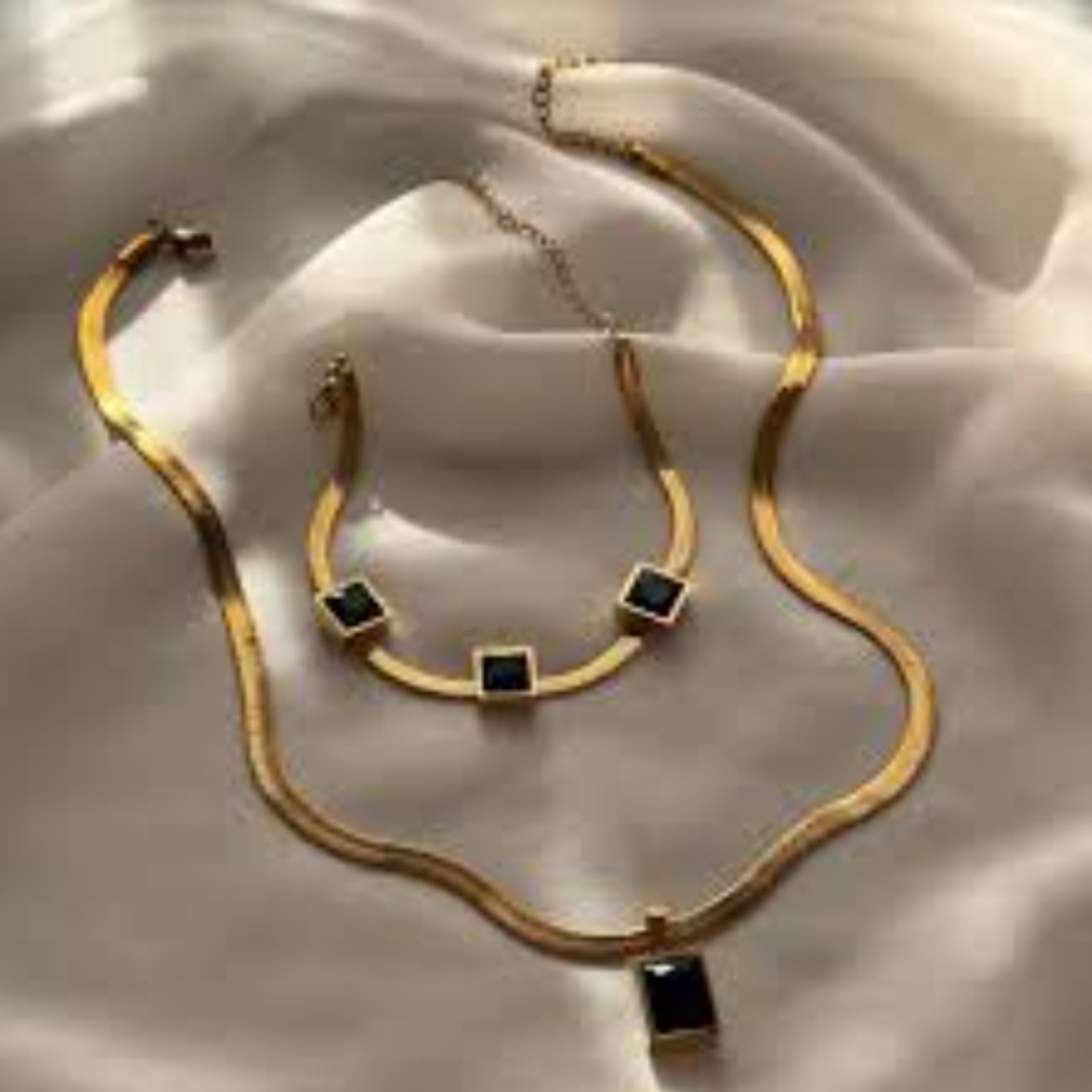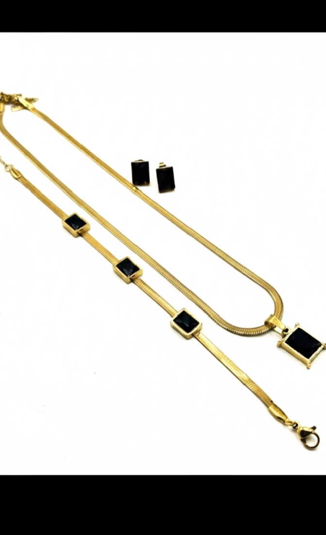This jewelry set features a sleek, modern aesthetic that blends the industrial durability of stainless steel with a sophisticated, high-contrast design. The combination of the gold-toned herringbone chain and deep black stones creates a timeless, “old money” look that works for both professional and evening wear.