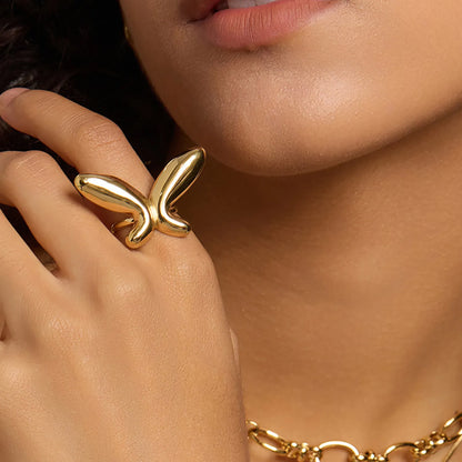 This piece is a striking butterfly-motif ring, blending a whimsical nature theme with a bold, modern aesthetic. Given your focus on stainless steel, this design is a perfect example of how that material can be engineered into fluid, high-polish forms that mimic the look of luxury gold while remaining incredibly durable and tarnish-resistant