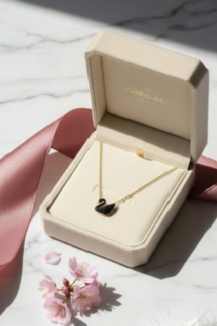 ​The piece is finished with a rich gold plating that provides a luxurious glow, perfectly complemented by the soft cream and pink tones shown in the branding.