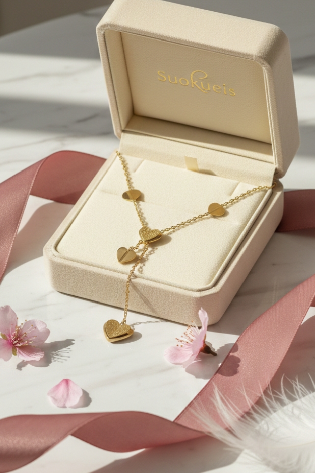 ​The necklace features a “Y” shape that draws the eye downward, creating a lengthening effect that works beautifully with V-neck tops or dresses. The drop section is anchored by a central heart, leading to a dangling heart charm at the end.