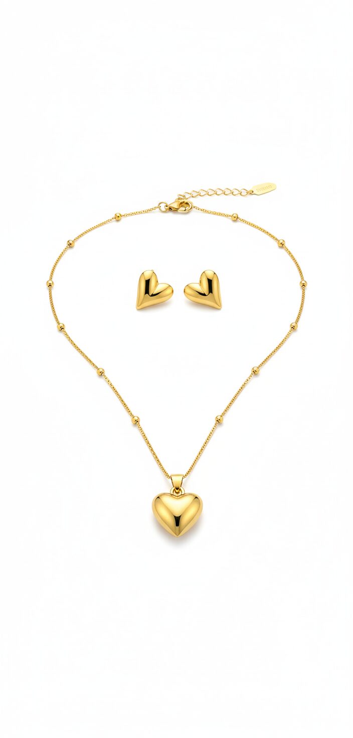 Puffed Heart Pendant Necklace & Stud Earring Set