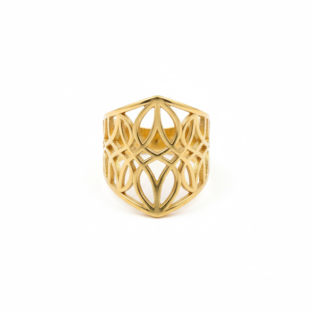 This striking gold-plated stainless steel statement ring features an intricate, openwork design that balances modern geometry with a touch of classic filigree.