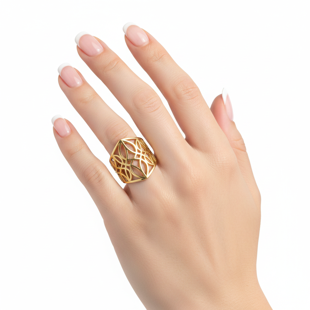 - Design: A bold, wide-band “lattice” or “cutout” motif. The pattern uses symmetrical, interlacing lines to create an airy yet substantial look, often referred to as a filigree-style geometric shield.