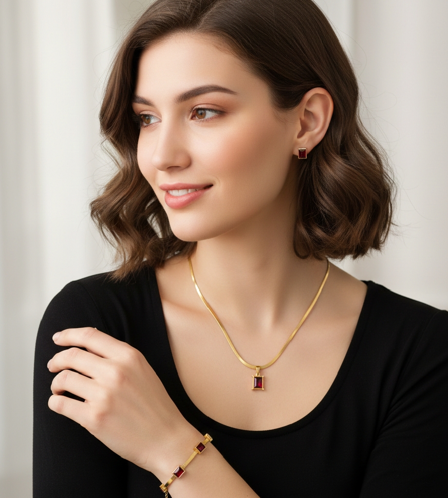 Emerald-Cut Ruby Red Jewelry Set Stainless Steel