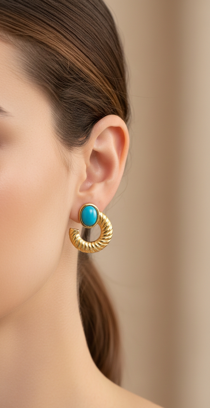 - Vibrant Turquoise Accent: Each earring is set with a smooth, oval turquoise-colored stone (or resin) that provides a bold pop of color against the gold.