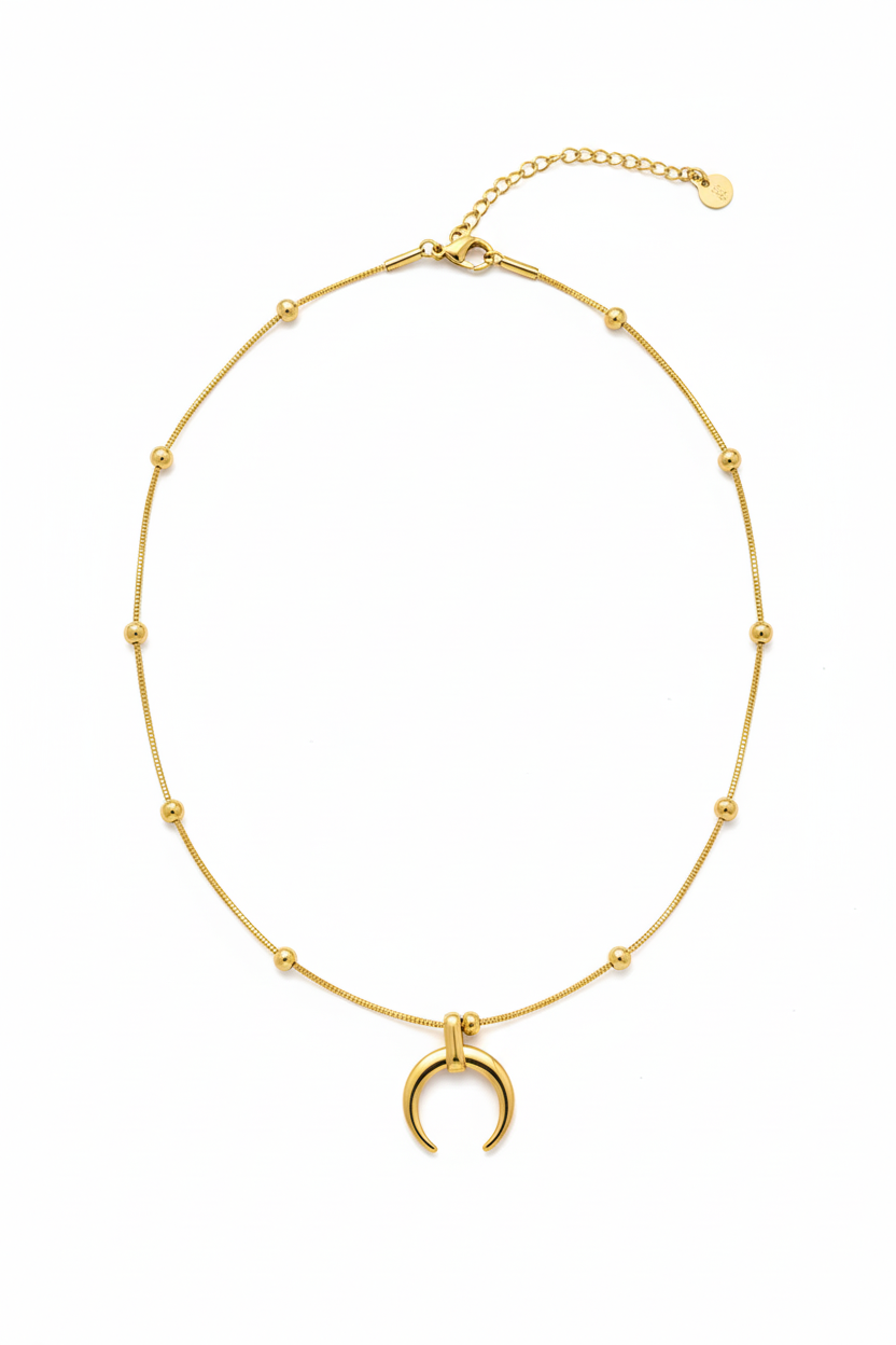 • Crescent Horn Pendant: Features a bold, polished “Tusk” or “Double Horn” crescent moon pendant, symbolizing strength and lunar energy.