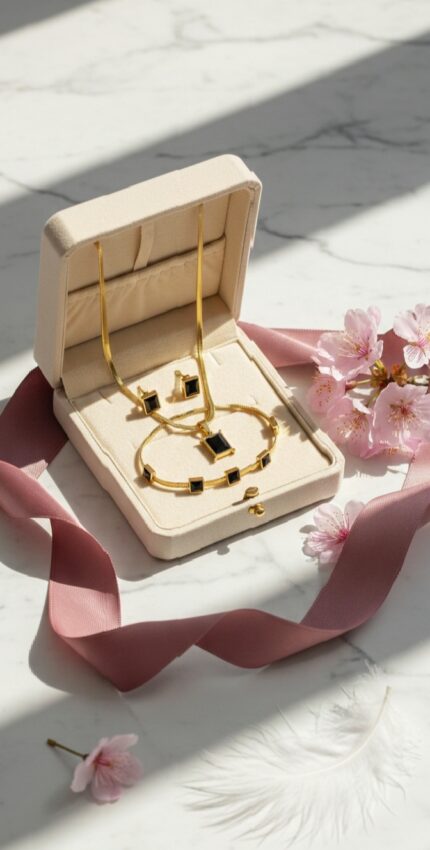 This jewelry set features a sleek, modern aesthetic that blends the industrial durability of stainless steel with a sophisticated, high-contrast design. The combination of the gold-toned herringbone chain and deep black stones creates a timeless, "old money" look that works for both professional and evening wear.
